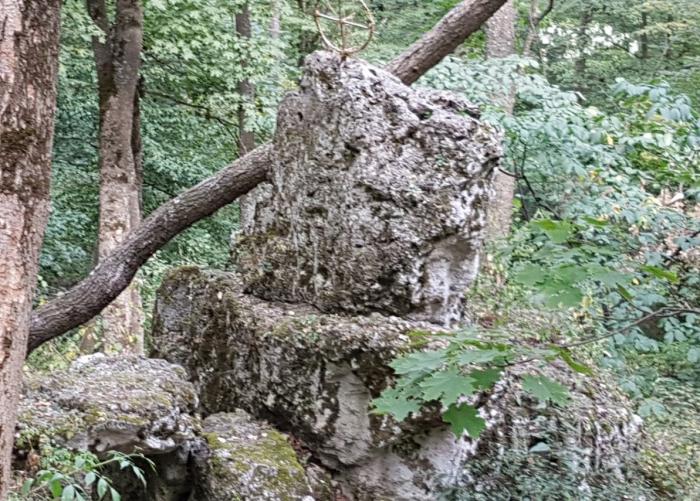 Далее, взяв курс на северо-восток и, перейдя городище, оказываешься у дольмена. Дольмен — это сооружение из двух или более огромных камней, поставленных вертикально и перекрытых сверху еще одной горизонтальной плитой.